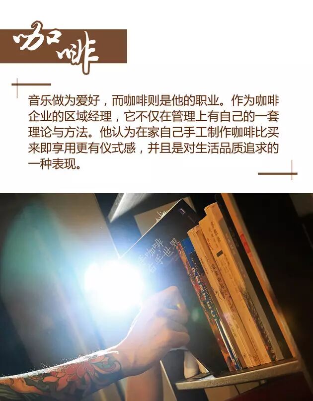 “只是隨意的撥動吉他,簡短的前奏,午后沒有重量的陽光跳進(jìn)薄薄的窗紗,抿一口咖啡,濃郁的味覺傳遞咖啡氤氳的氣息。”看似小資的畫面,好像有些做作,但這背后卻隱藏著一個大男孩對于生活的熱愛。
