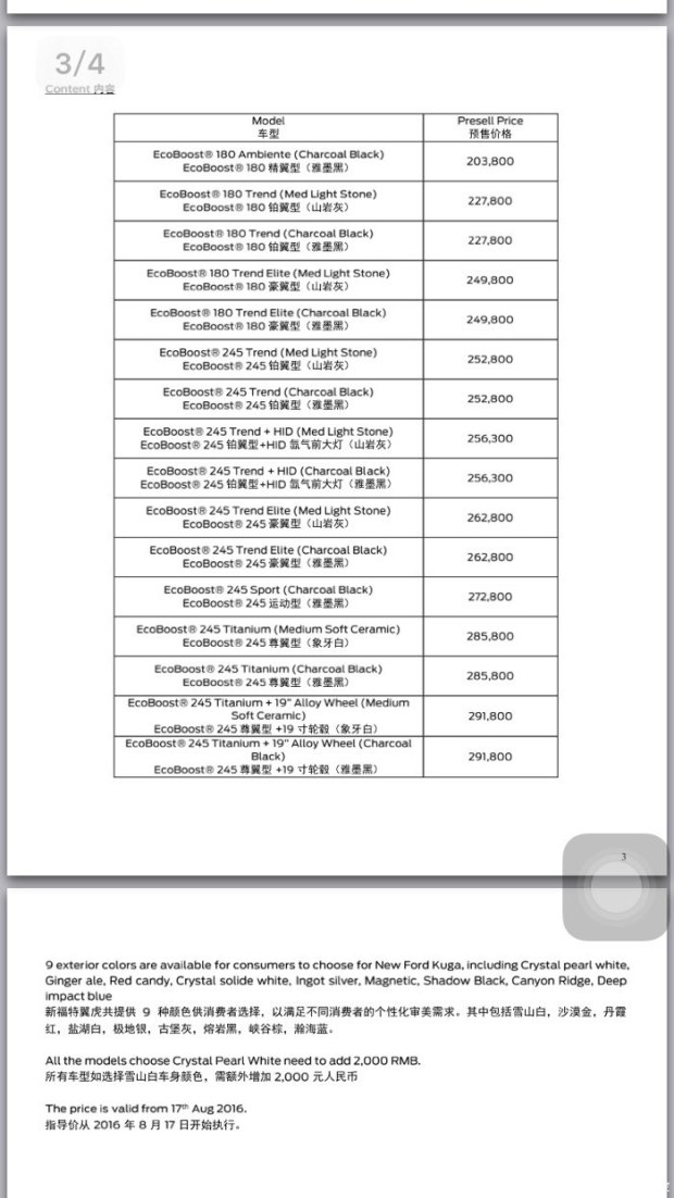 邵陽(yáng)長(zhǎng)安福特爆料,新款翼虎的EcoBoost 245 四驅(qū)鉑翼型還將推出HID氙氣前大燈選裝包,該選裝包價(jià)格為3500元,增加選裝包后的EcoBoost 245 四驅(qū)鉑翼型預(yù)售價(jià)為25.63萬(wàn)元;EcoBoost 245 四驅(qū)尊翼型將會(huì)提供19英寸輪圈的選裝包,該選裝包價(jià)格為6000元,增加選裝包后的EcoBoost 245 四驅(qū)尊翼型預(yù)售價(jià)為29.18萬(wàn)元。